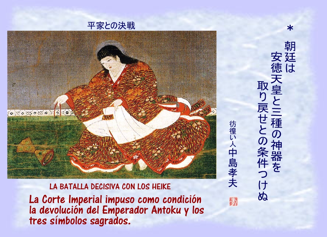 La Corte Imperial impuso como condición la devolución del Emperador Antoku y los tres símbolos sagrados. |