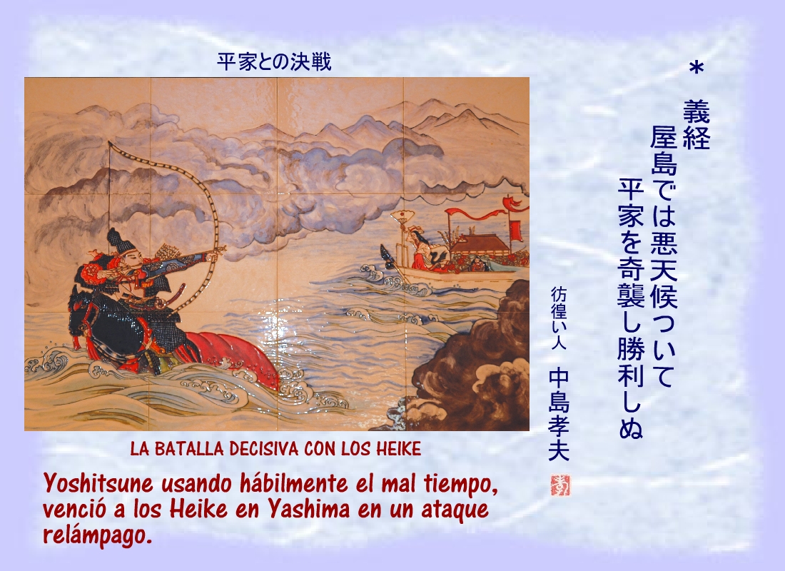 Yoshitsune usando hábilmente el mal tiempo, venció a los Heike en Yashima en un ataque relámpago. |
