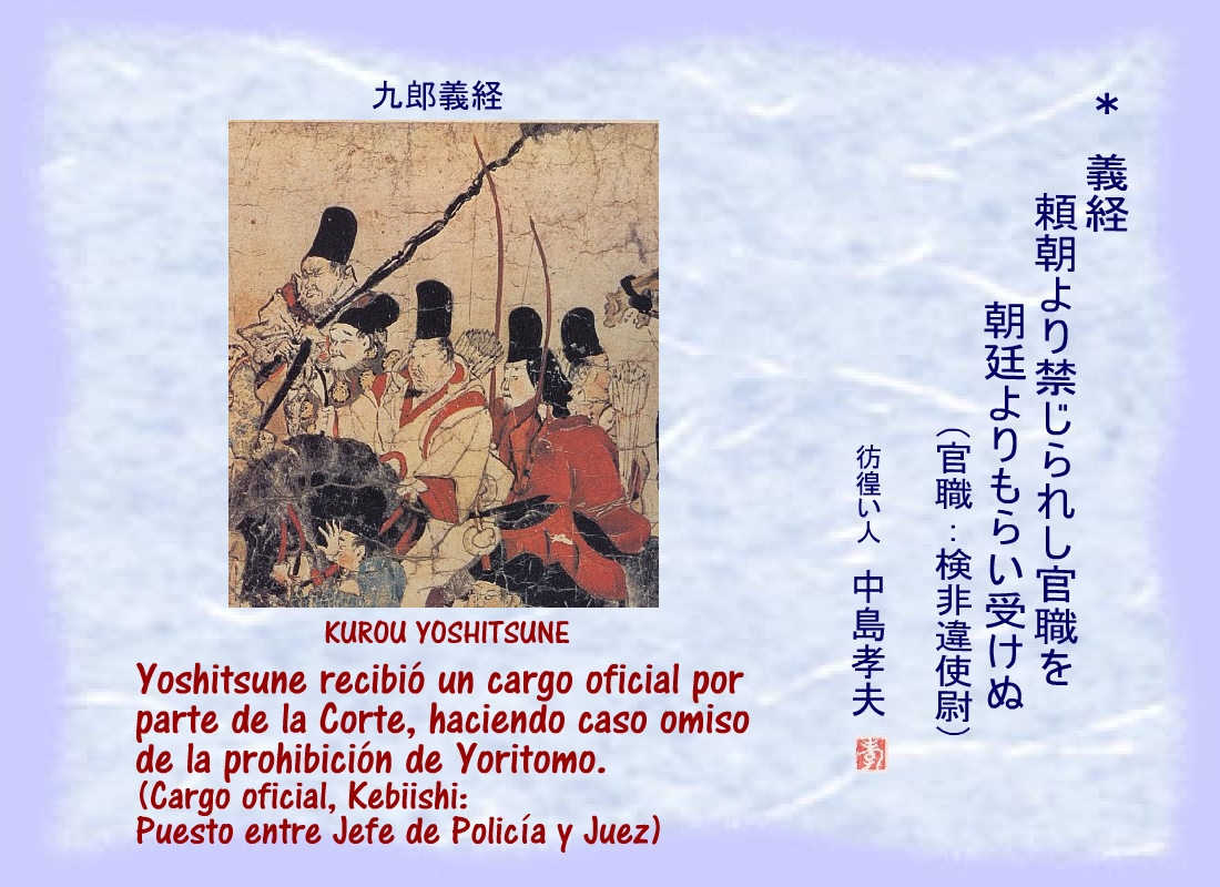 Yoshitsune recibió un cargo oficial por parte de la Corte, haciendo caso omiso de la prohibición de Yoritomo. (Cargo oficial, Kebiishi: Puesto entre Jefe de Policía y Juez) |
