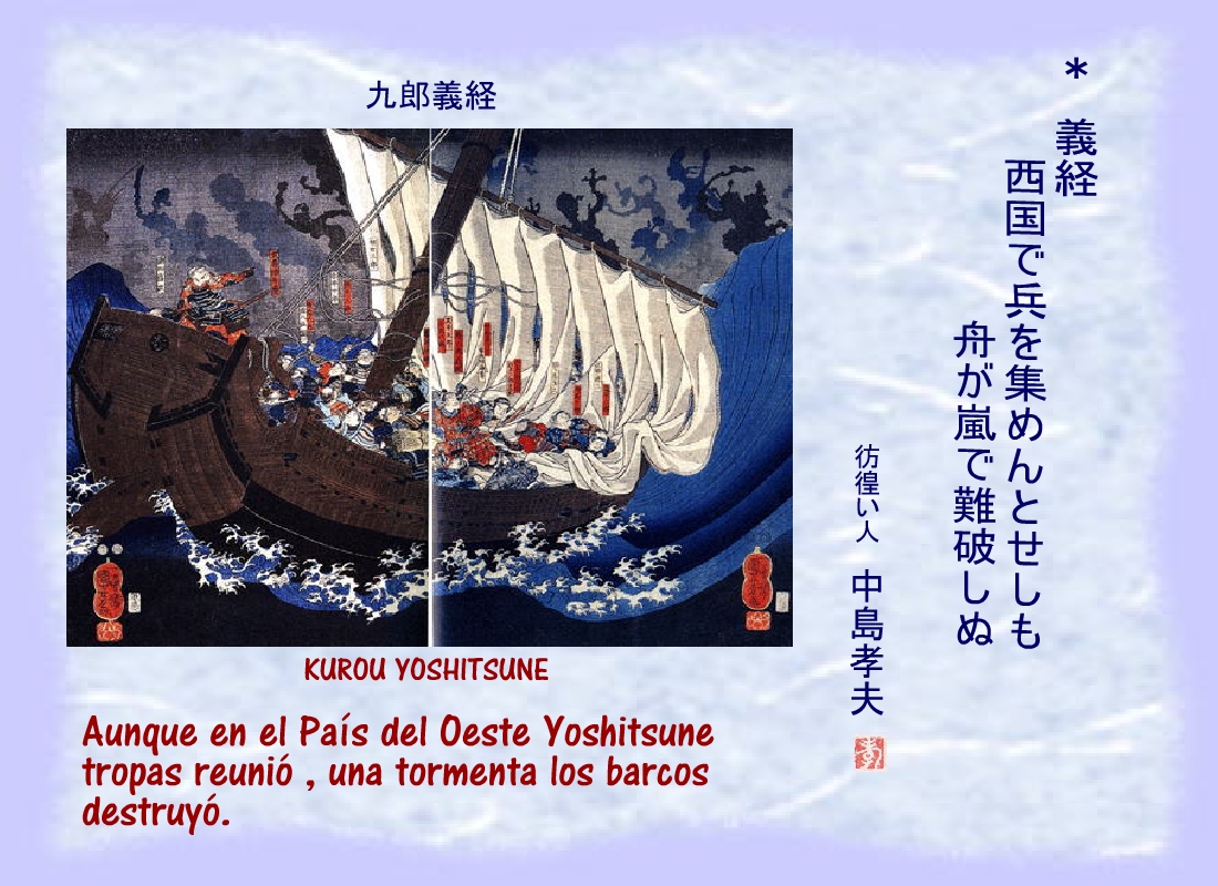 Aunque en el País del Oeste Yoshitsune tropas reunió , una tormenta los barcos destruyó. |