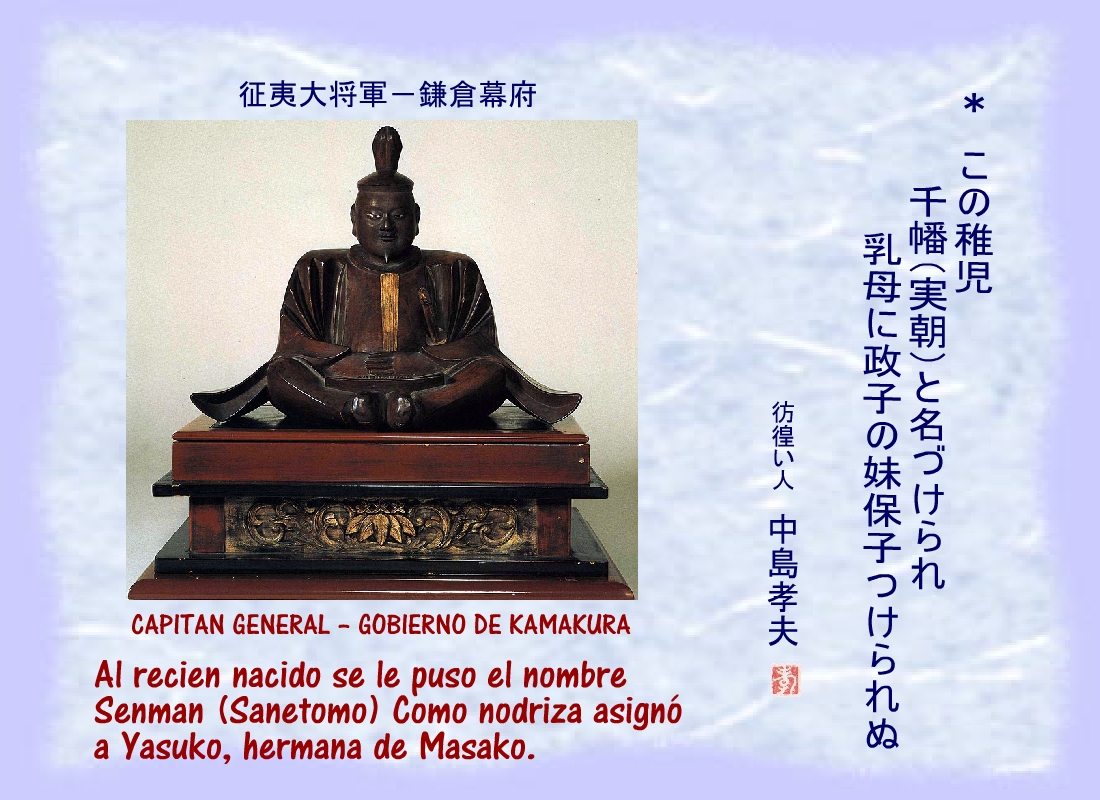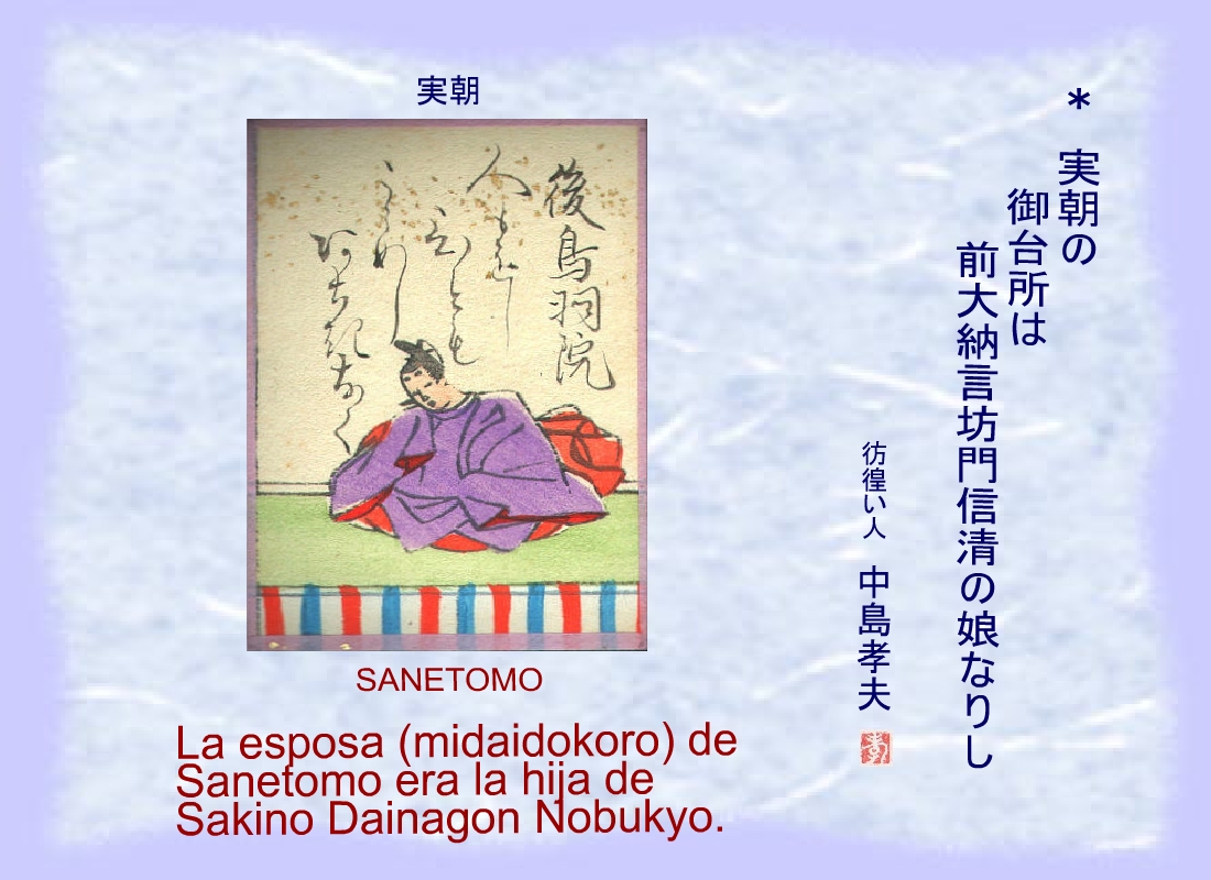 La esposa (midaidokoro) de Sanetomo era la hija de Sakino Dainagon Nobukyo. |