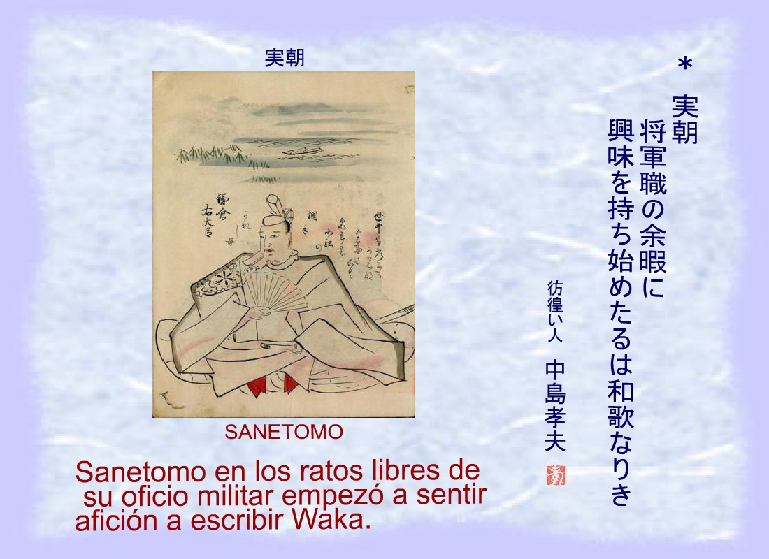 Sanetomo en los ratos libres de su oficio militar empezó a sentir afición a escribir Waka. |