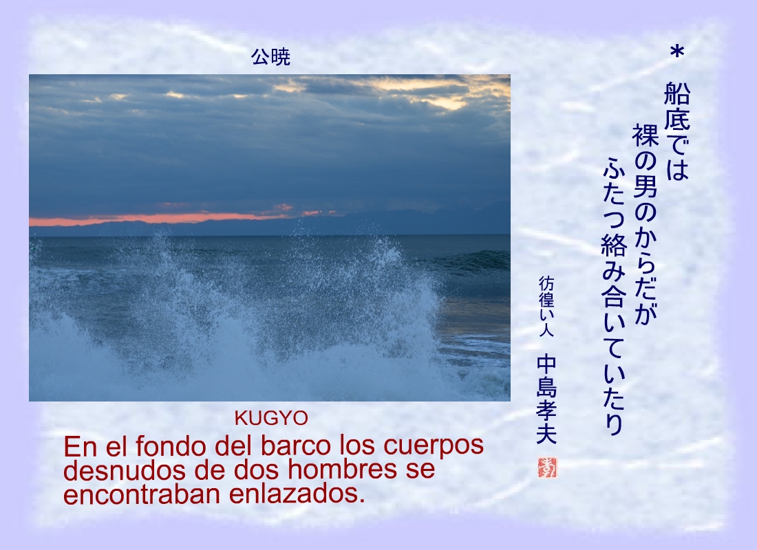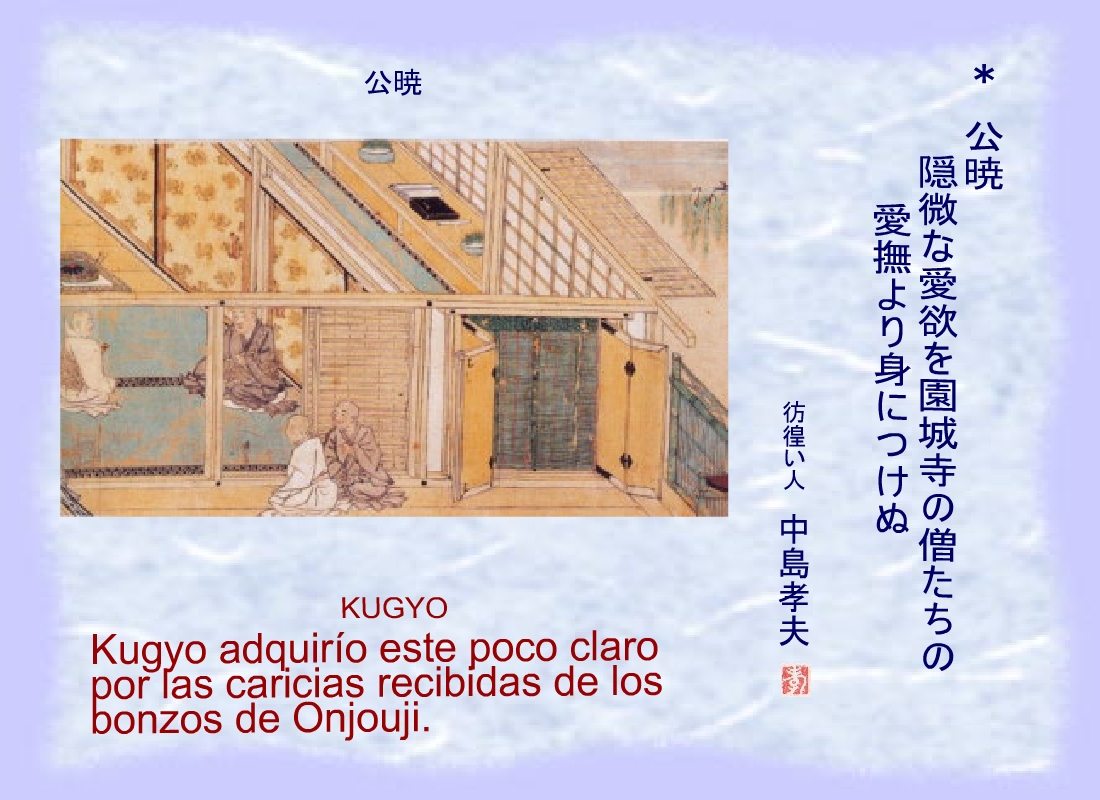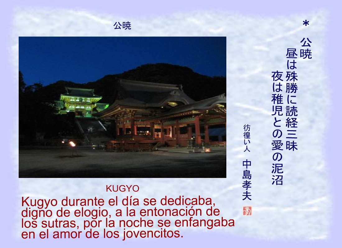 Kugyo durante el día se dedicaba, digno de elogio, a la entonación de los sutras, por la noche se enfangaba en el amor de los jovencitos. |