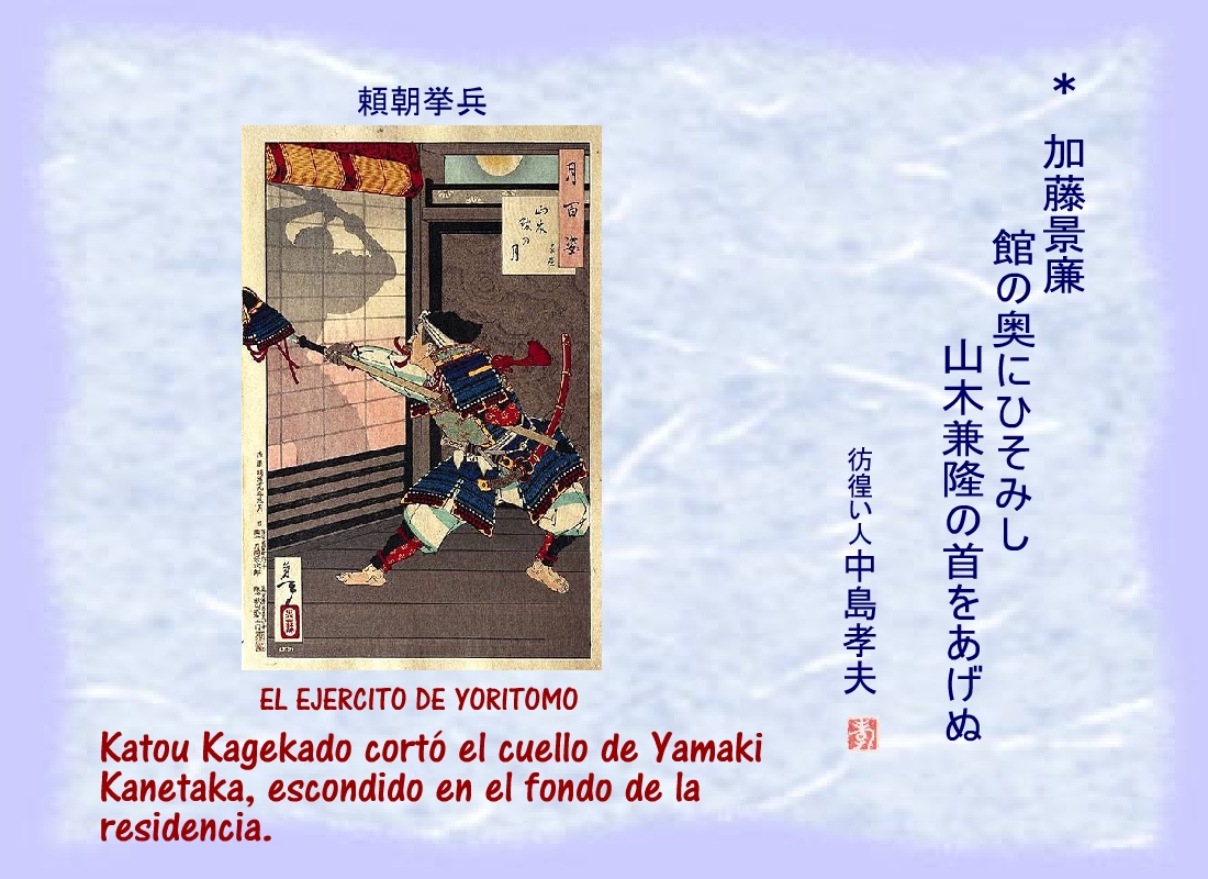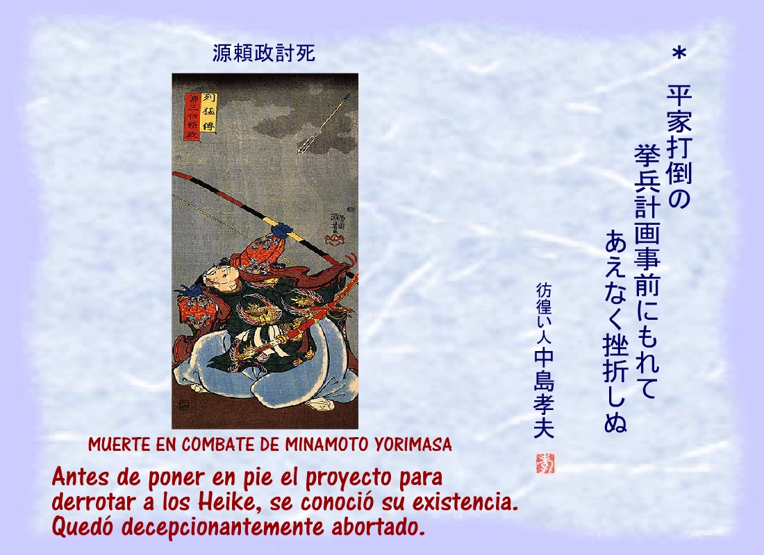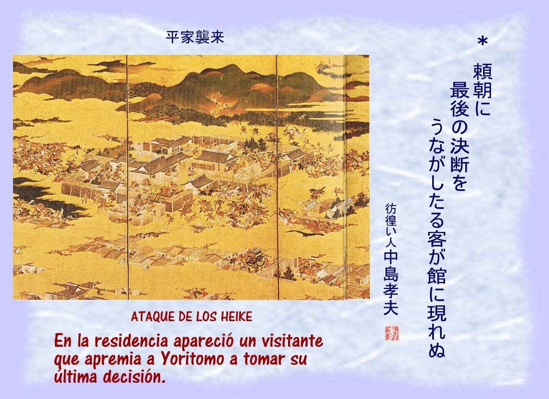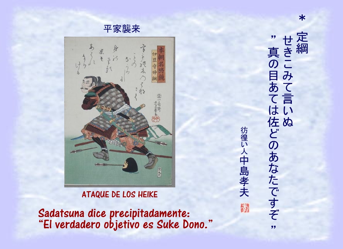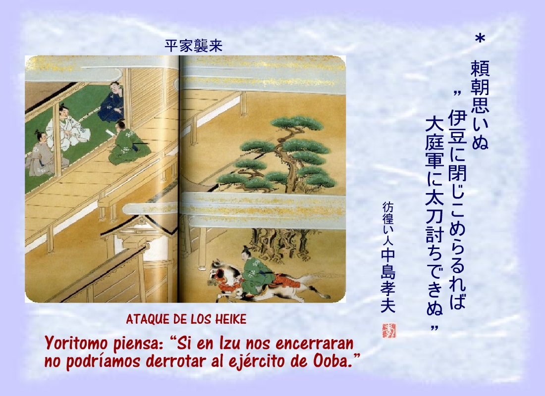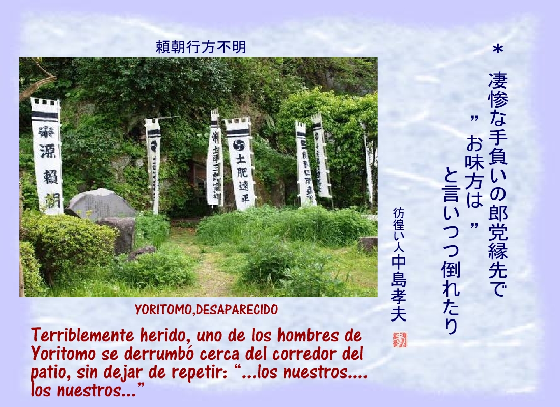 Terriblemente herido, uno de los hombres de Yoritomo se derrumbó cerca del corredor del patio, sin dejar de repetir: “...los nuestros.... los nuestros...” |
