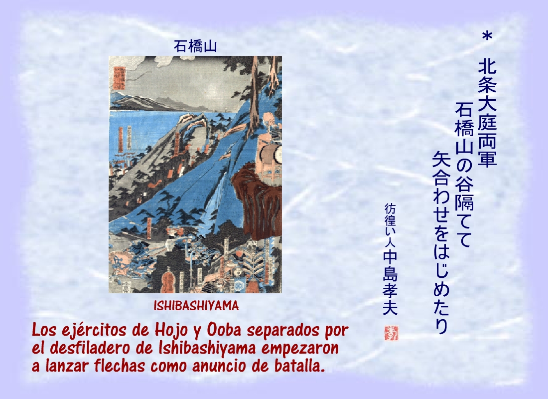 Los ejércitos de Hojo y Ooba separados por el desfiladero de Ishibashiyama empezaron a lanzar flechas como anuncio de batalla. |