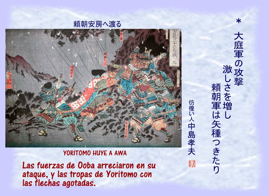 Derrotado por las fuerza de Ooba, los guerreros de Bando esparaban a Yoritomo en Awa. |