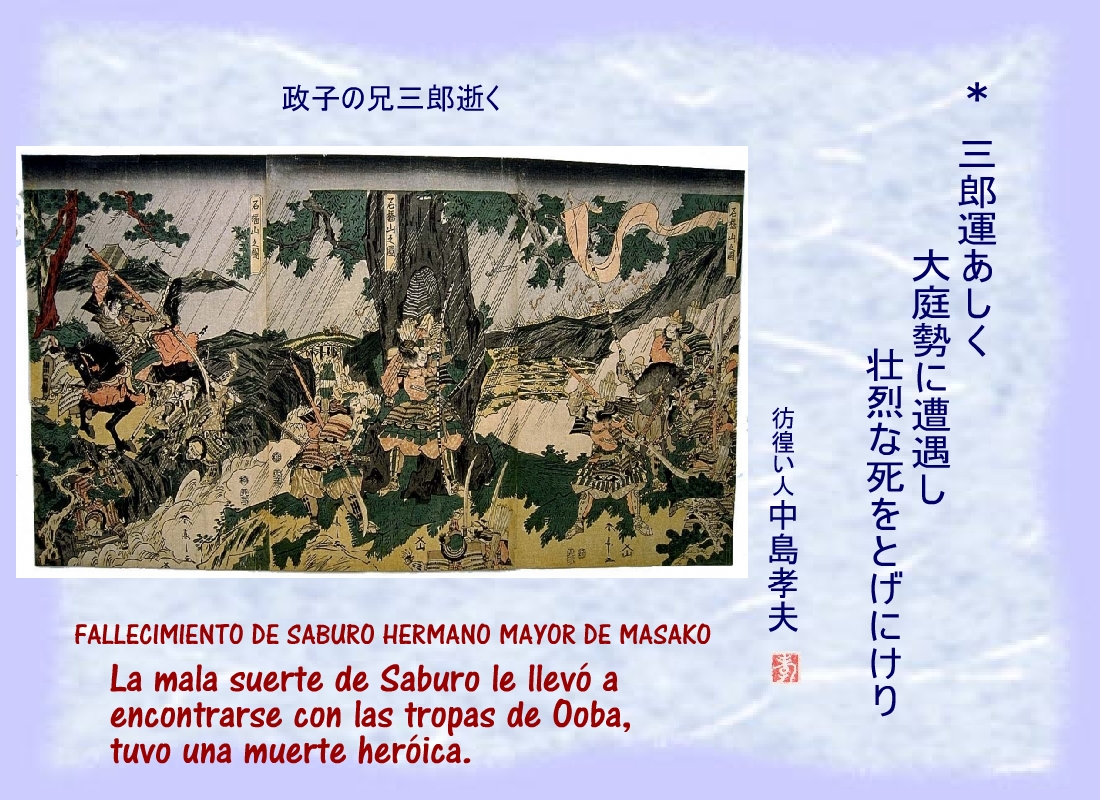 La mala suerte de Saburo le llevó a encontrarse con las tropas de Ooba, tuvo una muerte heróica. |